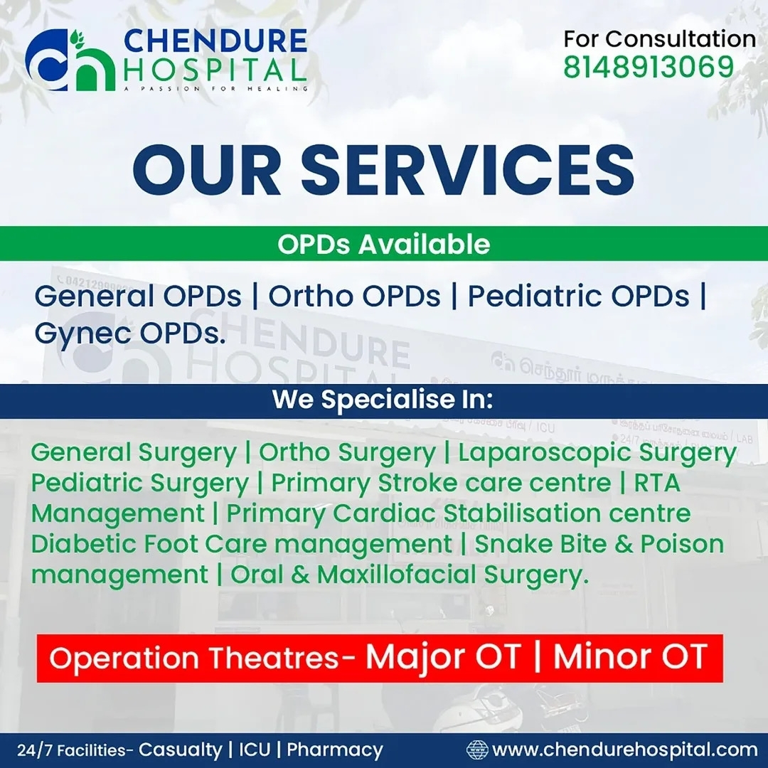 Chendure Multispeciality Hospital is located in Somanur, making it easily accessible for patients from Mangalam, Avinashi, Tirupur, and nearby areas. The hospital is situated on a main road with convenient parking facilities and public transport access.